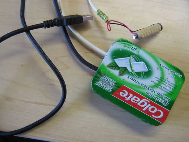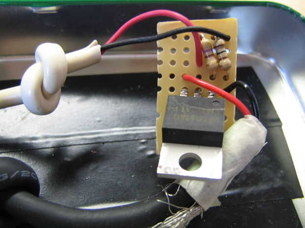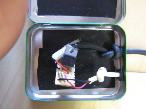 Usé una vieja lata de chicle recubierta con cinta aislante donde importa y unas arandelas de goma de un viejo disco duro para proteger los cables contra bordes afilados en el metal. .