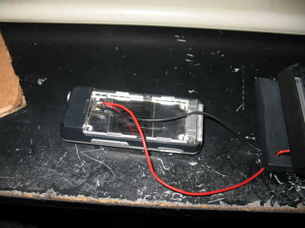 8. ya que no queremos un tirón o descarga para meterse con los terminales soldados, después de soldar, encolado una longitud de los cables de alimentación dentro del compartimiento de la batería de Sansa (el lugar donde pegue a palillo de la arena). Usé pegamento Krazy porque no pude encontrar mi pegamento caliente. Más bien habría utilizado pegamento caliente, como se puede quitar más fácil.