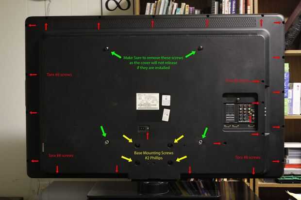 1. hay 4 #2 tornillos Phillips que sujetan la base en la unidad. Eliminar estos. Lo hice con la vertical sobre la base de la unidad. Una vez que los tornillos se quitan con cuidado levante el televisor directamente el soporte situado en la parte inferior y luego cuidadosamente volcarla cara abajo. Puede recibir ayuda como la pantalla sin la base es todavía fuerte y rebelde.