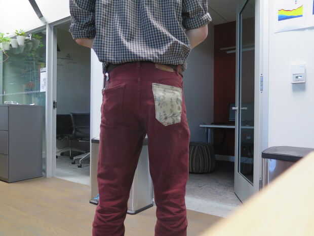 Ahora es el momento de mostrar su trabajo práctico. Si no te gusta la gente busca en el trasero, uso un tejido que coinciden con el color del resto de sus pantalones. Elegí una tela sobraba del proyecto de otra persona, pero nada gruesa Yes deja de funcionar bien.