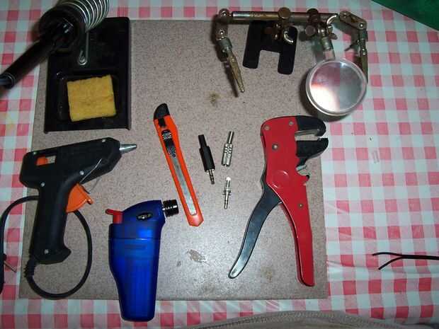 Junto con el soldador estándar, un nuevo jack y tal, hay algunas otras cosas que necesitarás. Necesitarás un cúter o cuchillo X-acto para anotar el cable exterior antes de usar un alicate pelacables para quitar la cubierta externa. También necesitarás un microtorch y una pistola de pegamento caliente. algunas personas también les gusta tener un poco de papel o cinta aislante, pero en mi caso, he elegido no a usarlo. También quisiera señalar dos estilos diferentes de 3.5 milímetros TRS gatos - usted necesita solamente uno - el tipo de plástico es más barato y se ve más 'original', pero yo prefiero el metal i uno ha tenido el plástico unos deshagan post soldadura por lo menos una vez, a pesar de estar internamente muy similar.