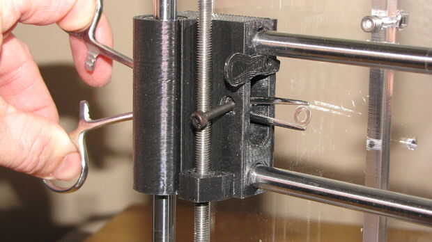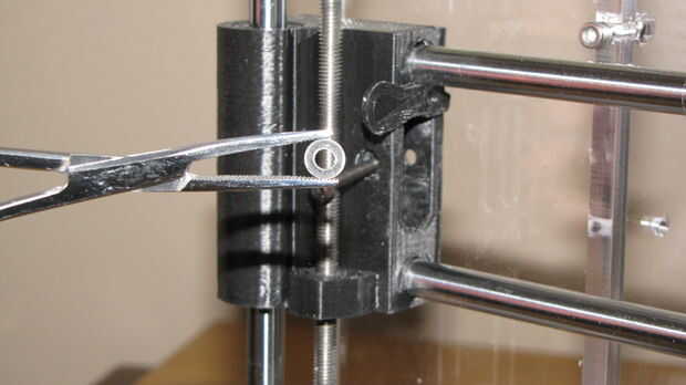 Coloque el tornillo M3x20 ligeramente en el orificio, lo suficiente como para colocar la primera arandela en él. Utilicé una pinza hemostática para llevar a cabo la mayor parte de este trabajo, pero pequeño, largo alicates también deberían funcionar bien.