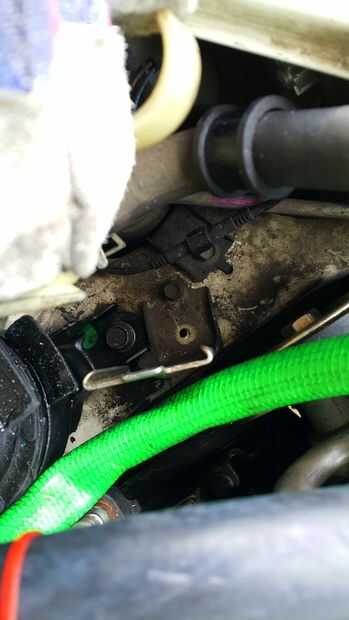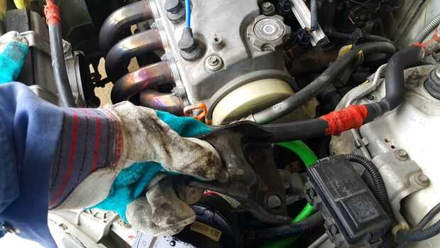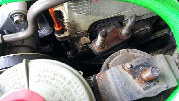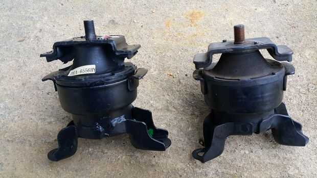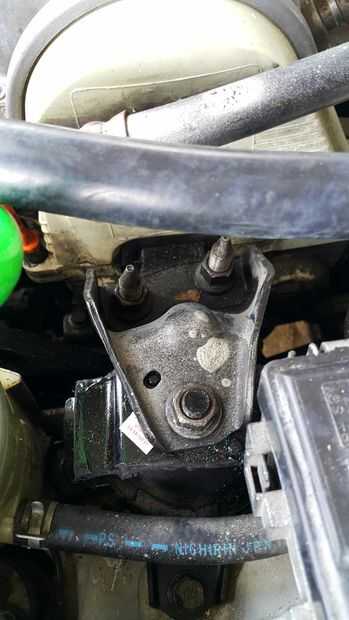 Puedes ver los montes viejos y nuevos. Poniendo la nueva montura en tenía un problema extraño. El soporte del depósito de dirección asistida impidió que la nueva montura alineándola con los agujeros del chasis. He quitado un perno de 10mm del soporte y gira del Monte.