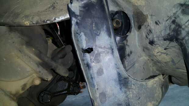 El plástico protector tuvo que ser retirado. La tuerca del perno de centro más dos tornillos 14mm fueron retirados. Tres tornillos de 17mm fueron aflojados en la transmisión. 2 se eliminaron permitiendo la Asamblea a abatir.