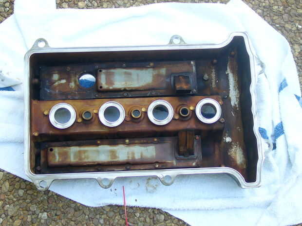 #1 (o tal vez #2) destornillador de cabeza plana ayudará el viejo material fuera de las ranuras en la cubierta de la válvula.