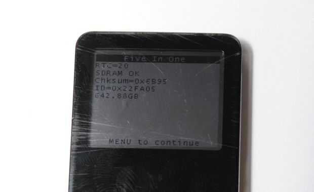 Bueno no exactamente, parece que este ipod tuvo problemas un poco más que una batería rota, después de la carga y tratar de hacer que funcione en modo de diagnositc recibí la segunda imagen: un espacio total de disco duro 642,88 GB de espacio en disco.