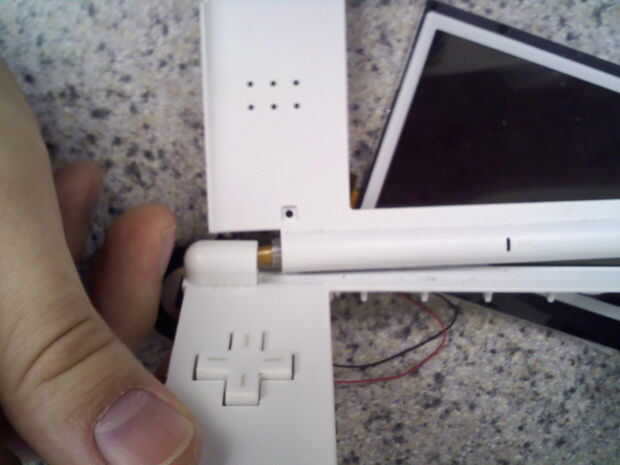 Una vez que la luz indicadora está desatornillada, la parte superior de la DS puede ser desconectada de la parte inferior. Deslice la parte superior de la pantalla a la derecha. Una vez que se desconecta la parte de arriba, el cable del LCD puede ser alimentado a través de la bisagra. Que mina había enrollado y había pegado a él a través.