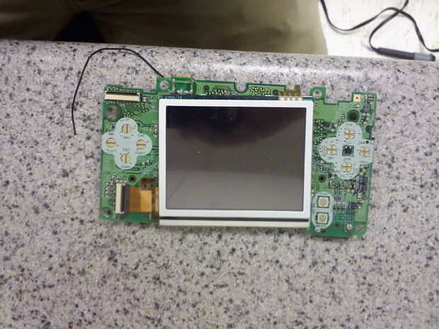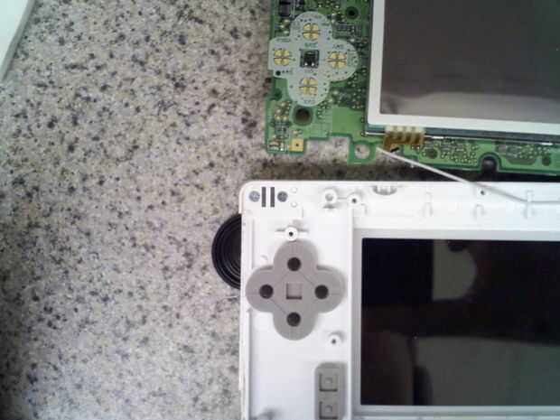 Ahora que la mayoría de las conexiones en la parte superior de la DS, la principal tarjeta de circuitos puede desenroscarse y se puede desconectar la pantalla superior. después de sacar el tornillo en la placa de circuito principal, cuidadosamente mueva la Junta hasta exponer la pantalla superior LCD pantalla conector. Todas las piezas de plástico para los botones, así como las almohadillas de goma será suelto así que asegúrese de no perderlos. Utilizando un pequeño flathead destornillador o un exacto cuchillo, levante la parte negra del conector, debe levantar y el cable de cinta debe se deslicen fácilmente. Una vez que se desconecta el cable de cinta, la placa de circuito principal es gratuita y se puede colocar fuera de al lado.