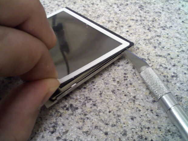 Hay dos partes en el mecanismo de la bisagra. La parte más grande es lo que hace clic y bloquea la pantalla en posición. La otra pieza es simplemente un acoplamiento de metal. La parte más grande puede necesitar extraer con unos alicates de punta. Asegúrese de quitar ambos. Lo único por hacer es estallar hacia fuera de la pantalla. La pantalla se ha quedado atascada en allí bastante bien así que tómate tu tiempo, no quieren romper la pantalla y tienes que esperar dos semanas para un reemplazo. Lento, aplique presión uniforme a los lados diferentes. Mi shell de reemplazo también vino con un protector de pantalla de repuesto para la pantalla superior. Si desea reemplazar tuyo, utilice un cuchillo del exacto para levantar lentamente.