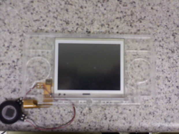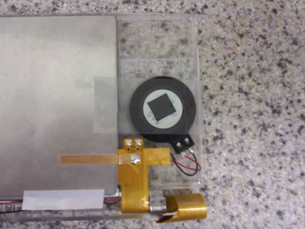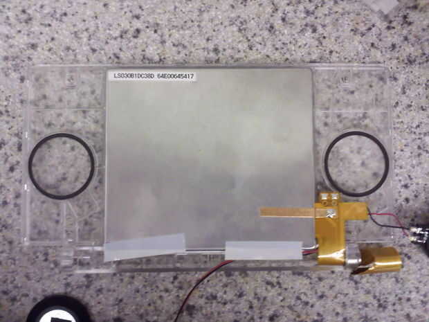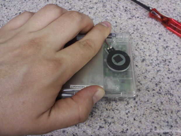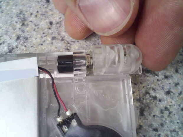 Después de las dos piezas están juntos, la bisagra click se coloca en la parte superior y la luz indicadora se atornilla en lugar. Ya me olvide de poner la pieza translúcida de la luz, no se muestra en la imagen. Colocar los electrodos de botón en siguiente y había conectado el cable de cinta del LCD a la placa de circuito principal.