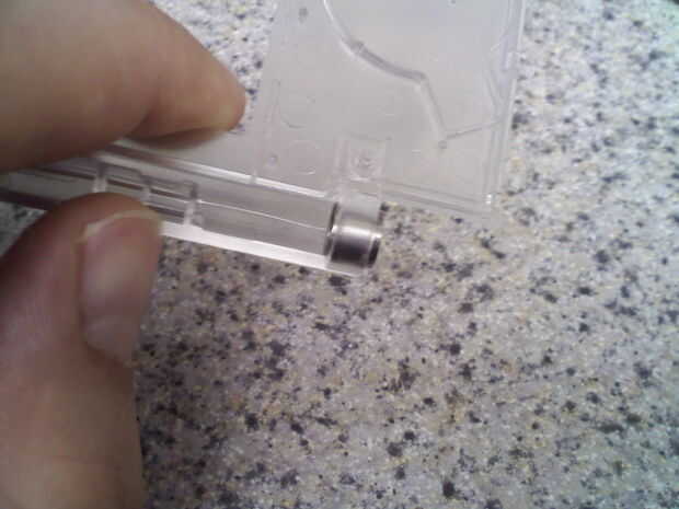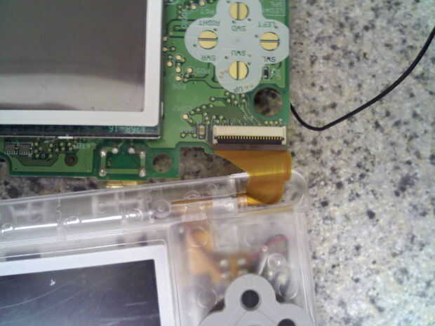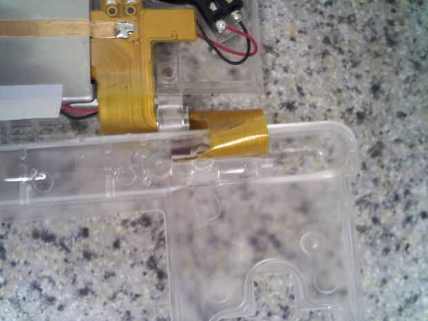 A continuación, poner la bisagra metálica de acoplamiento en su lugar, enrolle el cable de cinta del LCD y empuje a través de. Ahora toma la parte superior de la parte de abajo de tu DS, el uno que los botones palillo para arriba y coloque el cable por la ranura y deslice en la parte superior.