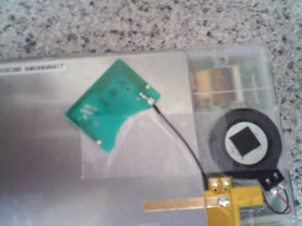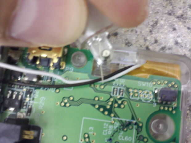 A continuación, puede alimentar el cable del micrófono y la antena de wifi a través de la bisagra. En mi foto, coloqué la antena del micrófono en la ranura de juego de DS pero debe ser alimentado por debajo de la placa de circuito principal. Asegúrese de que meta los cables de micrófono y el altavoz abajo en la ranura. Grabado esto así porque encontré que los cables le gustaba saltar.
