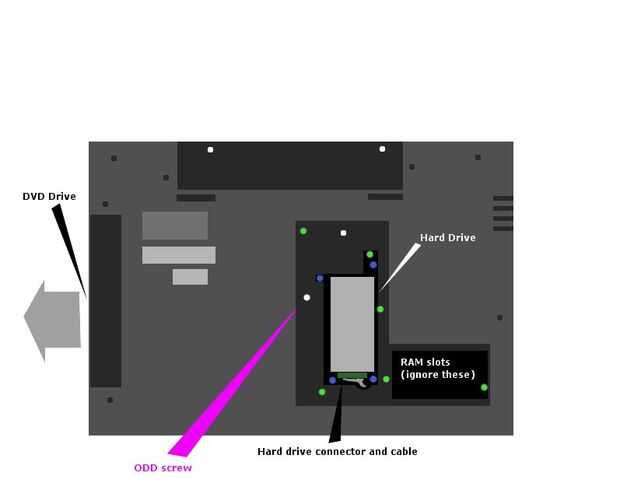 -A continuación, Quite los cuatro tornillos de retención de disco duro (mostrado en azul) y éstos a un lado. El disco duro (se muestra en gris claro) ahora es perder dentro de su apertura empotrado. Levántela de este compartimiento y desconectar el cable del disco duro presionando suavemente el conector (que aquí se muestra en verde oscuro) al final del disco duro. Dejar de lado el disco duro.