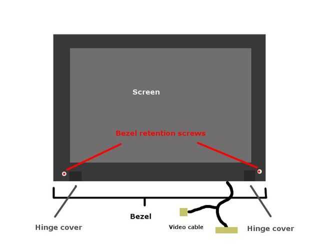 -El bisel está sujeto por dos tornillos, uno en la parte inferior derecha y la otra en la parte inferior izquierda de la pantalla (ver primera imagen). Retire tanto los tornillos del bisel. Colóquelos a un lado.