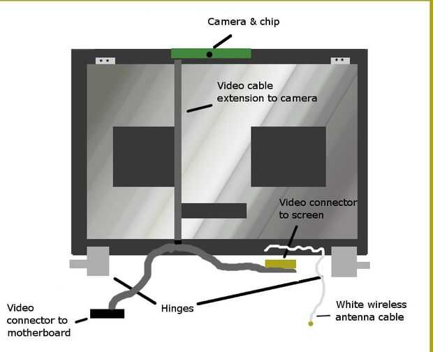 -Ahora buscas en el desnudo interior de la tapa. El siguiente paso es quitar la vieja pantalla de la cubierta. La pantalla está sujeta por cuatro tornillos y dos conectores de cable de video en un video cable (ver segunda imagen). Quitar los cuatro de los tornillos de retención de la pantalla.
