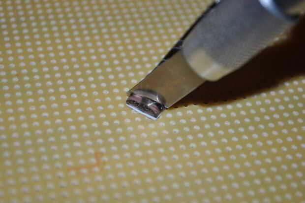 b. utilizar la navaja x-acto cuidadosamente Presione uniformemente para cortar (no cortar) a través del gel de agua prueba capa hasta que la hoja se apoya justo detrás de los contactos de cobre. Mueva lentamente la hoja a través de los contactos en un barrido o raspado de movimiento (no movimiento de corte) la capa de gel claro se desprenda revela contactos de cobre. Nota: Sólo exponer un extremo.