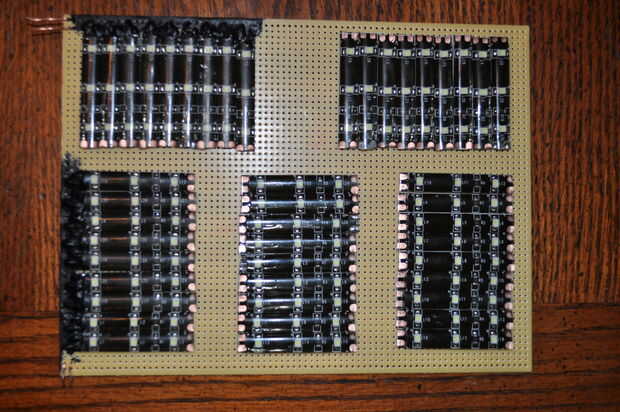 f. en la parte posterior de la Junta, doblar los alambres perpendiculares a la franja de luz simplemente conectado y al borde de la tabla a lo largo de la columna A y B. (Estos serán los conductores de alimentación para las tiras de luz de resto que fije a la Junta).