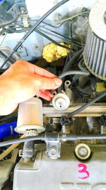 El delgado tubo de vacío al regulador de presión de combustible fue fácil de quitar y reemplazar con la manguera de silicona de tamaño adecuado. Tbolt abrazaderas también aquí pongo también.