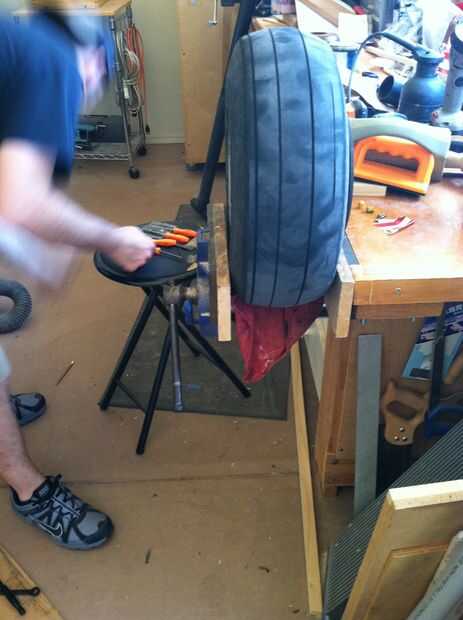 se utilizó una mordaza de mesa de madera para squeeeze el neumático de su grano. también intentamos saltar en el neumático. después de un rato nos bajamos lo...