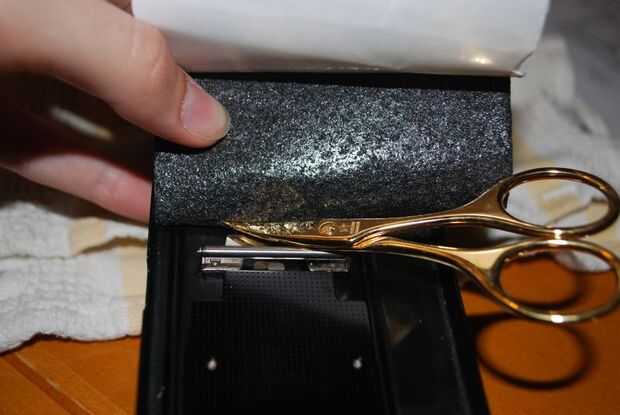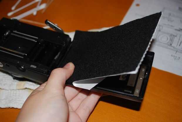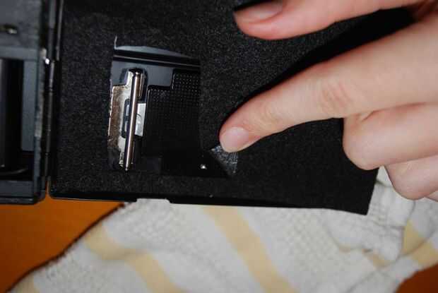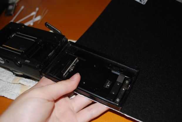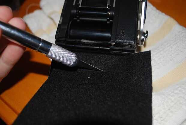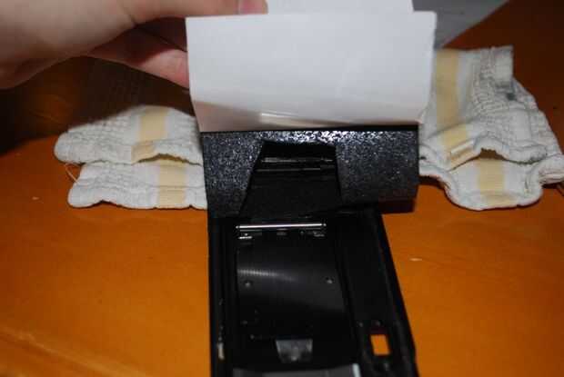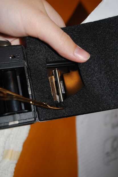 (4) a través del uso (9) el cuchillo x-acto y tijeras poco espacio lejos de clip para el plástico de nuevo que la película se apoya contra el que va a través de su cámara. Me tomó un tiempo, wittling lejos en él con mis herramientas! Mina había recortado al ras con el borde del resto de la película.