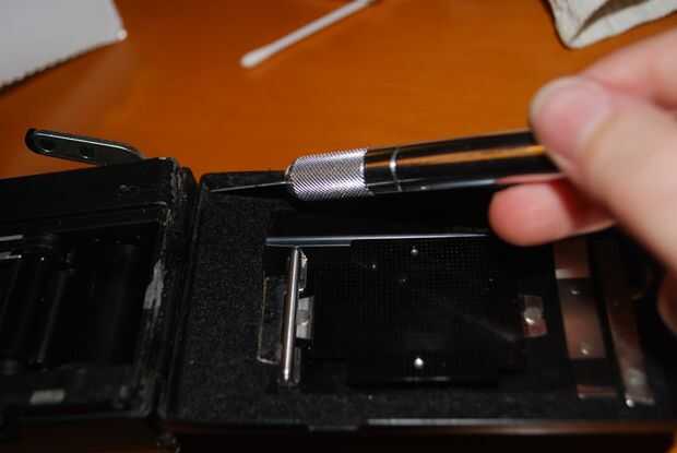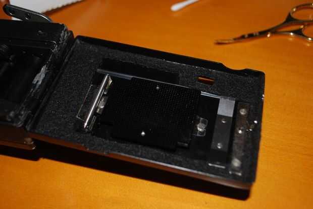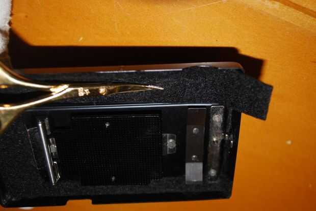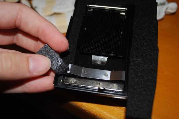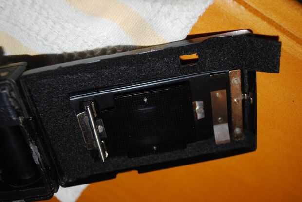 (3) Utilice el cuchillo del exacto (y pequeñas tijeras si es necesario) que recorte el área del visor. También puede eliminar algunos de fieltro a la izquierda, pero tenga cuidado de no tomar apaga demasiado.
