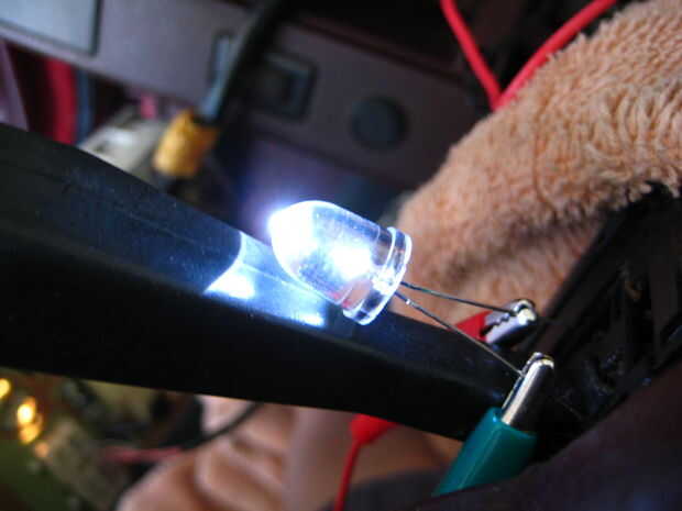 Estaba totalmente que entusiasmado trabajando pensé que quedaría en el agujero para ver cómo se vería el LED desde el otro lado. Mis luces se apagan. Hizo saltar un fusible! No sabía lo que era en el tiempo, comprueba todos los fusibles y todo parecía OK. Aunque estaba equivocado, pero no tomo nada aparte estaba bien al final. Tuve que comprar fusibles aunque.