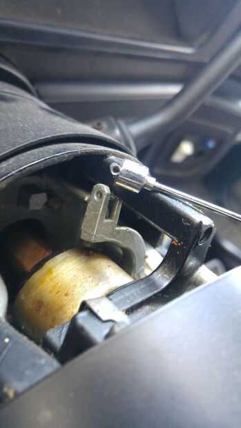 Para quitarla, tome un minúsculo objeto contundente (como uno de los accesorios de alicates de anillo retención) sobre el perno, y muy dulce toque eso perno hacia fuera. Esto es donde tener un imán telescópico viene muy bien. Seguí mina al lado del pin en todo momento para no volar hacia fuera a través de la cabina una vez libre de la palanca.