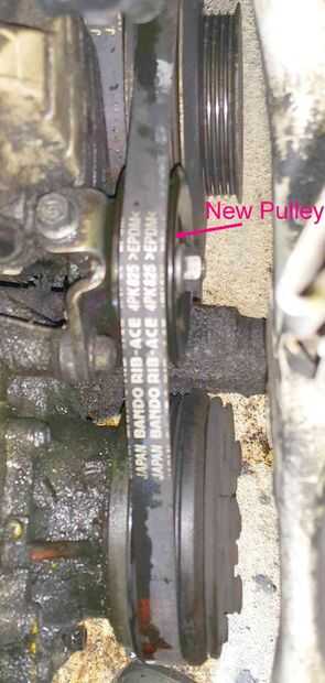 La instalación es la inversa de la extracción. Una vez que la tensión de la correa, se aprieta la tuerca de la polea. Ahora mi coche tiene una nueva polea de AC y planea comprar un par más ya que esta polea tiende a fallar fácilmente.