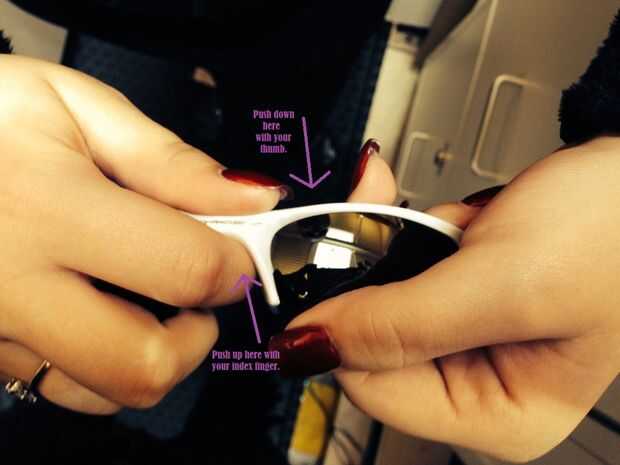La primera curva de la lente que debe eliminarse es la esquina más cercana a las almohadillas de la nariz. Para quitar este rincón, empuje firmemente hacia abajo en la parte superior de la estructura ubicada por encima de la lente con el dedo pulgar. Al mismo tiempo que empuja hacia abajo en la parte superior del marco, debe levantarse en que la parte inferior del armazón situado entre las lentes con el dedo índice. Las áreas que deben presionarse en están indicadas por las flechas en la foto de arriba.