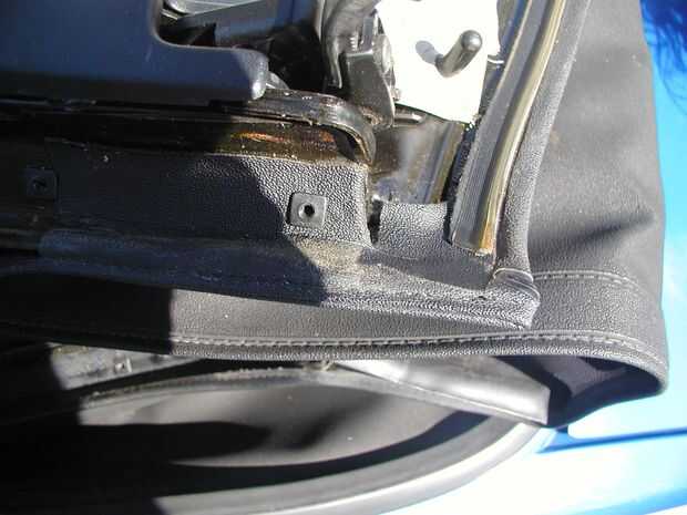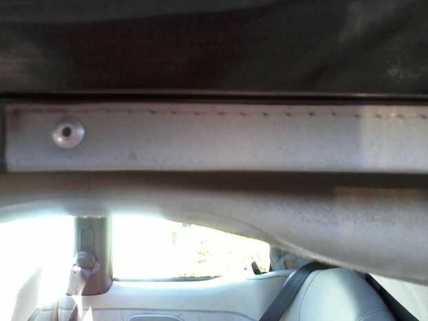 Buscar otras áreas manteniendo la parte superior, como el colgajo (fotografiado) con remaches pop. Perfore el centro de los remaches con una 1/8 broca para eliminarlos. El Cabrio tiene también una correa marco con sujetadores plásticos que se quitan apalancando suavemente aparte las dos mitades. No pierda estos, ya que será difíciles de reemplazar.