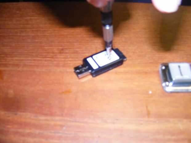 Retirar la carcasa de fijación que están ocultas debajo de la etiqueta. Los localicé por sensación para los orificios a través de la etiqueta y el empujar la punta del destornillador a través del sello para liberar y quitar los tornillos.
