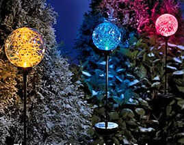 Cada luz del jardín con energía solar se presenta como un globo de cristal delicado en una estaca; un panel solar en la estaca alimenta una bombilla LED en el mundo. Existen varios modelos de diseño similar.