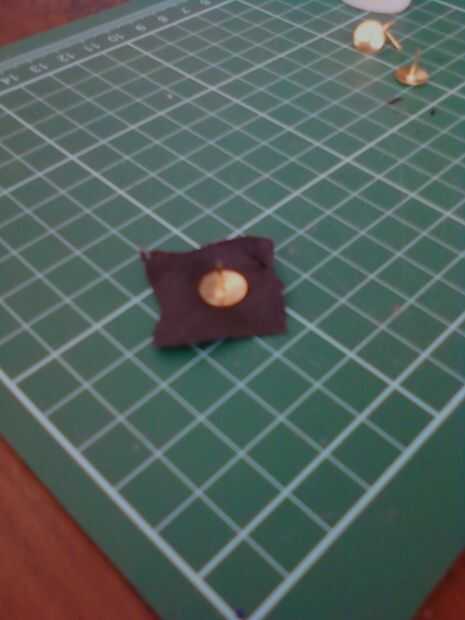 Corte un pequeño pedazo de cinta del hockey y coloque el lado pegajoso hacia arriba, empuje la chincheta en la cinta y cortar alrededor del borde para que la cinta hace un círculo ligeramente más grande alrededor de la tachuela.