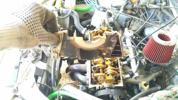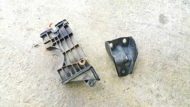 tuve que apoyar el recipiente colector de aceite del aceite y quite el soporte de motor superior para el perno de 10mm solitario sosteniendo la tapa interior. Una vez fuera lo pongo a un lado con el soporte. Más tarde lo desengrasar y poner adhesivo de silicona negra en las ranuras de la Junta.