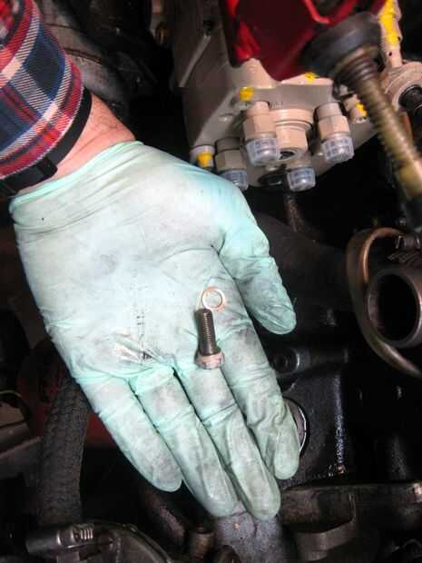 Hay un tornillo en el lado de la bomba de tiempo.  Está en el centro en el lado del conductor.  Esto es donde irá el calibre.  Saque el perno, no perder la arandela.