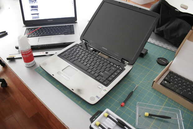 Ahora puede voltear el teclado e inserte las pestañas que sujetan la parte más cercana a usted. Esto debe ser otra operación suave que no requiere ningún forzamiento de piezas en lugares que no quieren ir.