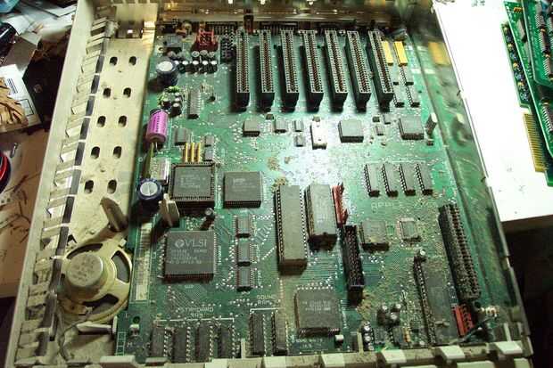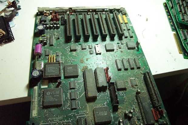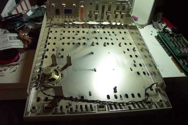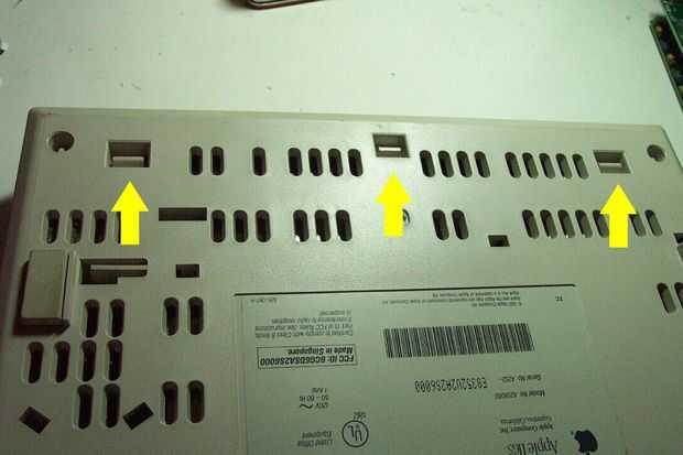 Ahora tenemos que quitar la placa base. (Ufff. ¿Recuerde lo que dije sobre complejidad)? La batería es, como se puede ver, situado debajo de la fuente de alimentación, pero tenemos que acceder a la parte inferior del tablero para quitarlo. Voltee la máquina y extraiga el panel frontal presionando cuidadosamente detrás las tres lengüetas de plástico grandes, marcadas con flechas amarillas en la foto. Súbalo lado derecho otra vez y desate la Junta aplicar ligera presión hacia arriba y con cuidado empujando hacia atrás las siete lengüetas de plástico pequeño que se muestra con flechas rojas, a partir de la parte delantera. La Junta simplemente balancea hacia atrás y se desliza hacia fuera.