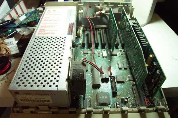 Encaje la placa madre en el caso primero alinear los conectores en los extremos con sus respectivos agujeros, y luego abisagrar la Junta hacia abajo y con cuidado la trabándola en su lugar. No doblar la placa o usando excesiva fuerza y verifique que todas las fichas están comprometidos. Luego coloque el panel frontal en su lugar, asegurándose de que los cables del altavoz se enrutan correctamente debajo de él. Ponga la fuente de alimentación en su lugar, y volver a conectar los cables internos (alimentación, altavoces y ventilador). Vuelva a colocar sus tarjetas en sus respectivas ranuras. (Se número, correcto?) Coloque nuevamente la cubierta sobre.