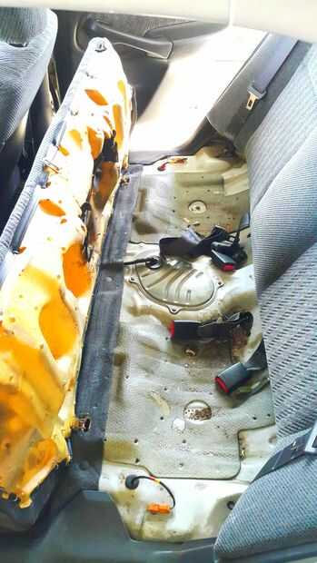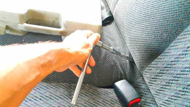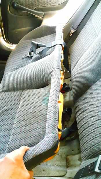 El asiento trasero es sostenido por un perno de 10mm que es de centro a la izquierda entre el relleno base y espalda. Una vez que el asiento trasero está hacia fuera de la bomba de combustible y calibre son totalmente accesibles.