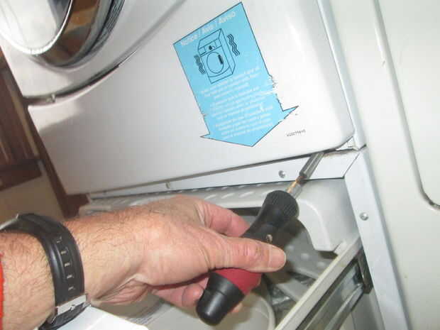 Utilice el controlador de la tuerca para quitar los tornillos en la parte inferior del panel frontal. Tire de la parte inferior del panel y colóquelo hacia abajo. Nuestra arandela está montada sobre un pedestal, por lo que esto hace que sea práctico para llegar a.