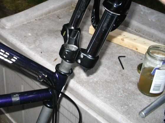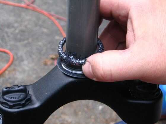 Instale los cojinetes. Si están en un cojinete de anillo de retención, deslice ese anillo a la taza del cojinete y la horquilla. Si son rodamientos individuales, instalarlos en el cojinete del auricular en el marco.