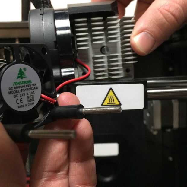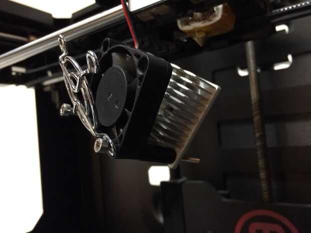 Los dos tornillos hexagonales habían ubicado en el frente de la Asamblea de la extrusora en la parte inferior izquierda y derecha las esquinas del ventilador. Estos pernos son largos y viajan a través de; el protector del ventilador, el ventilador, dos separadores de plástico, el disipador de calor y finalmente en el motor de la extrusora para mantener todo en su lugar. Al quitar estos tornillos tenga cuidado de no perder ninguno de los componentes. Coloque en un recipiente y apártelos para volver a armar. Asegúrese de recordar el orden de la parrilla, ventilador, espaciadores y disipador de calor.