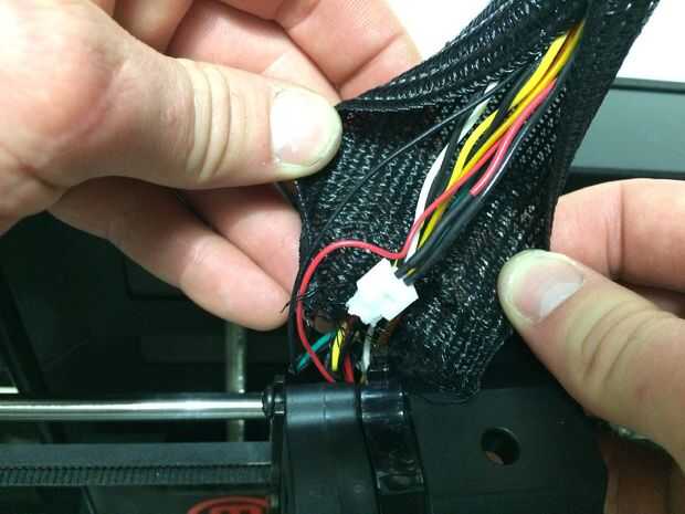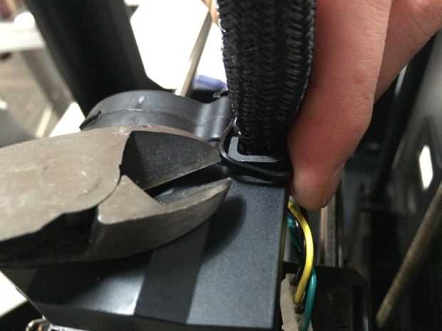 Usando un par de tenazas o en tijeras, con cuidado corte el cordón plástico que sujeta el protector de alambre de malla negra a la parte superior de la Asamblea de la extrusora. Después de que usted corte el lazo, abra el protector. Hay una raja hecha de antemano en el protector y debe abrir fácilmente con no más de corte necesaria. Dentro del protector encontrará la conexión del ventilador.