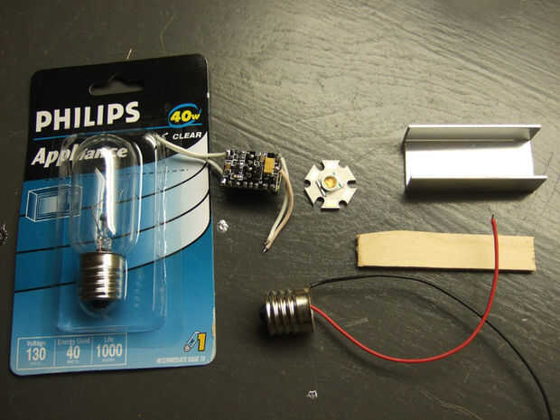 Este proyecto requerirá un puñado de piezas, en la foto a continuación. Su proyecto puede variar ligeramente dependiendo de la bombilla que va a sustituir, pero la idea básica es la misma. Los componentes principales son el LED y el conductor.