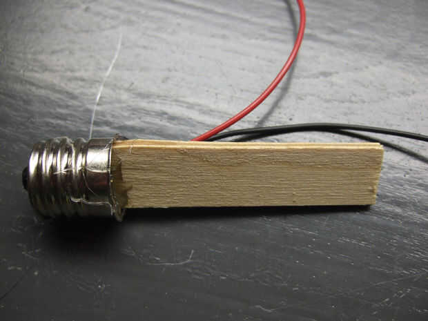 Con los cables en su lugar y firmemente soldadas, tome el trozo de madera y recortar a la medida. Con el apagado y la armadura, en que intenta poner el LED, tienes que atornillar la base metálica con cables en el aparato para ver donde la base termina rotatorio por lo que se puede alinear el LED con él. A diferencia de la bombilla incandescente, el LED es direccional y que necesita el LED para indicar la dirección correcta. Tome un marcador u otro método para marcar la alineación para el trozo de madera. Quitar la bombilla de metal base de la lámpara y pegar la tira de madera en su lugar según su marca con epoxi (Si utilizas pegamento caliente puede ablandar y desmoronarse en uso, que es muy peligroso ya que esto está conectada a 120V). Vuelva a colocar el conjunto en la luminaria para asegurarse que su alineamiento es lo suficientemente bueno. Unos pocos grados fuera no es gran cosa aquí.