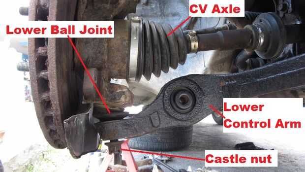 Retire el pasador de la articulación de rótula inferior y afloje (pero no eliminar) la tuerca almenada. El rótula tiene una conicidad en el brazo de control y tendrá que ser separados.