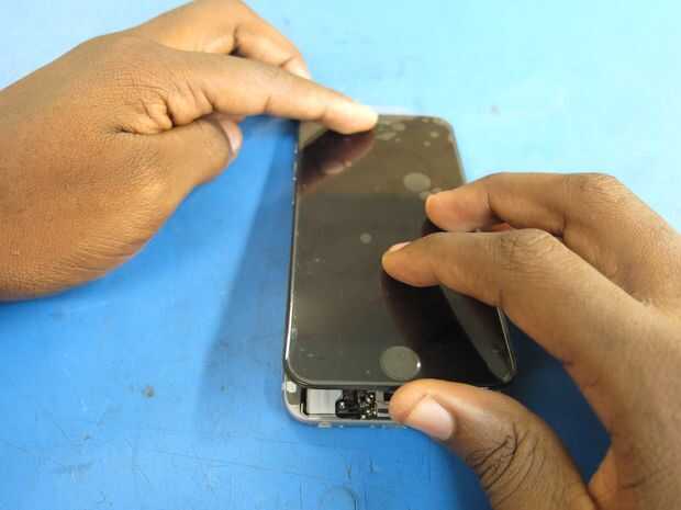 • Comenzar a cerrar el iPhone instalando primero el labio de la parte superior de la pantalla del panel frontal en la ranura en la caja trasera.