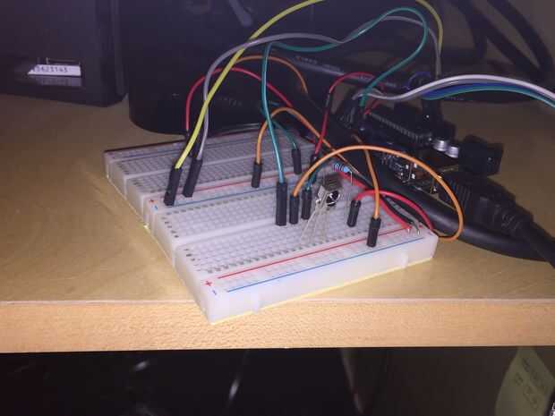 Coloque su dispositivo para que el LED enfrenta a receptor del dispositivo de control IR. En el ejemplo anterior, está sentado frente a un Apple TV. Para configurar, conectar el arduino al ordenador, ejecutar el. jar, siga la configuración y utilizar la aplicación para controlar Arduino!