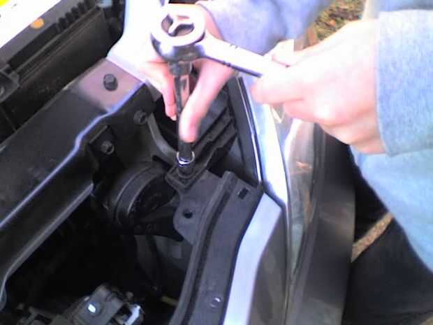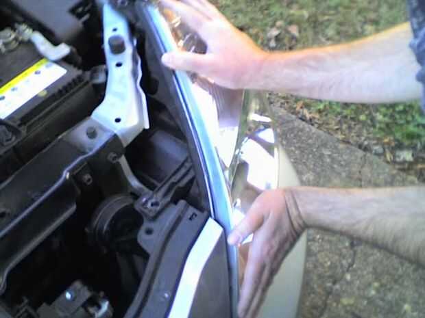 Con las luces apagado y la batería desconectada, el ensamblaje de la luz está alineado con el agujero de perno y fondo clips de retención.