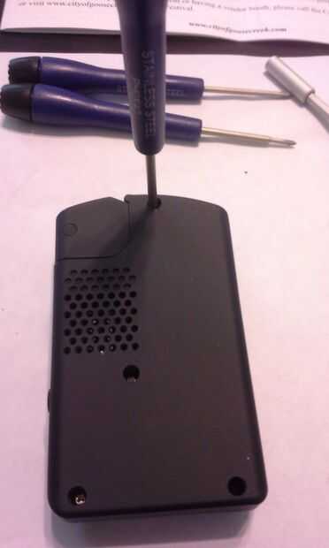 Usando #00 destornillador Phillips, afloje los 4 tornillos en la parte posterior de la unidad. No hay necesidad para quitar el tornillo que sostiene a la tapa del tirón.